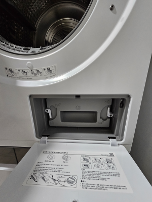 그러던 어느날, 디스플레이 창에 열교환기 청소하라는 메시지가 뜹니다. 이게 뭔가? 찾아보니, 건조기 하부(허리높이)의 열교환기 청소를 한 달에 한 번씩 하라는 겁니다.(일거리 +1) LG건조기에는 그런 열교환기 구멍 같은 것은 없었고, 청소하라는 얘기도 없습니다. 이 부분이 바로 사용 중 느끼는 삼성과 엘지 제품의 가장 큰 차이입니다. 열교환기(콘덴서)를 직접 세척하느냐(삼성), 자동으로 세척하느냐(엘지).