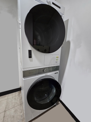 애정하는 삼성 제품으로 주문해서 설치를 했습니다. 하단 세탁기 20kg 모델, 상단 건조기 24kg 모델 조합(분리형)으로 2층으로 구성해서 설치했습니다. 빨래 후 건조기로 던져 넣기만 하면 되고, 그 자리에 서서 다 해결 가능한 점이 몹시 좋았습니다. 좁아터진 세탁실도 넓어졌습니다.